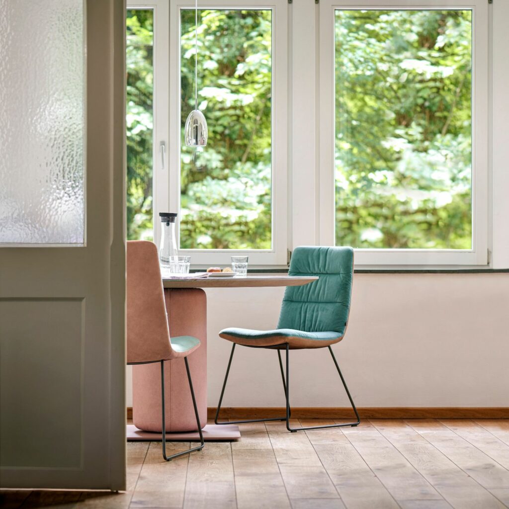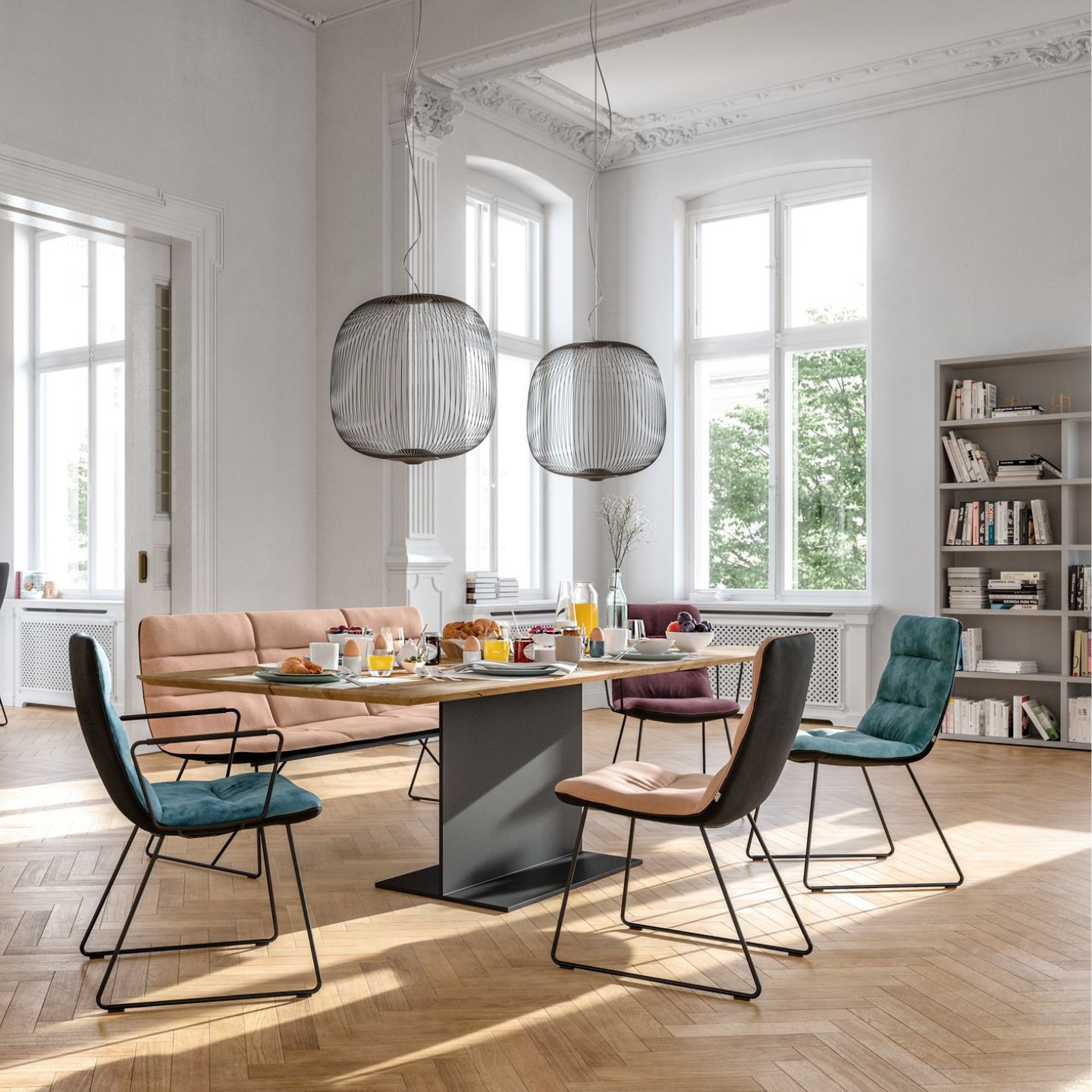Der Stuhl Arva Light hat im Gegensatz zum Modell Arva ein schlankeres Design: Sowohl die optionalen Armlehnen aus Metall als auch die Polsterung der Sitzschale sind zierlicher gestaltet. Dadurch verleiht die Light-Ausführung jedem Raum eine offene Atmosphäre. Die Linienführung ist fließend, fast wie eine zarte Umarmung, die zum Verweilen einlädt.