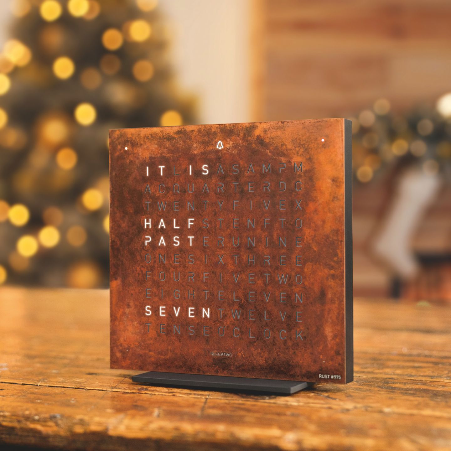 Wenn Sie die QLOCKTWO MOON lieben, lohnt sich ein Blick auf QLOCKTWO EARTH: Die Wortmatrix mit 110 Buchstaben zeigt Zeit in Fünf-Minuten-Schritten, ergänzt durch vier Minutenpunkte in den Ecken für die minutengenaue Anzeige.