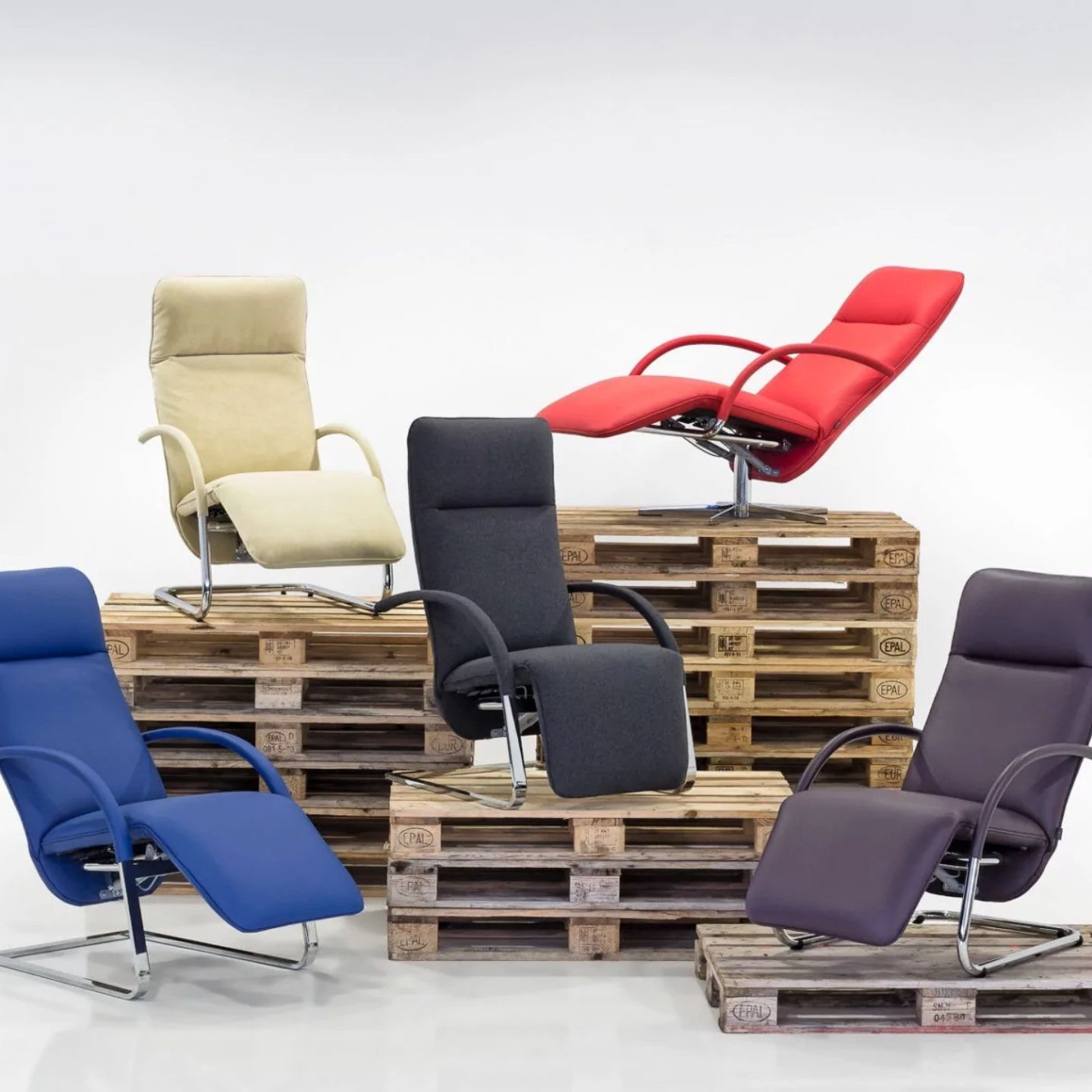 Die Freischwinger können glänzend oder matt verchromt sein, der Standfuß ist aber nur in Hochglanz erhältlich.