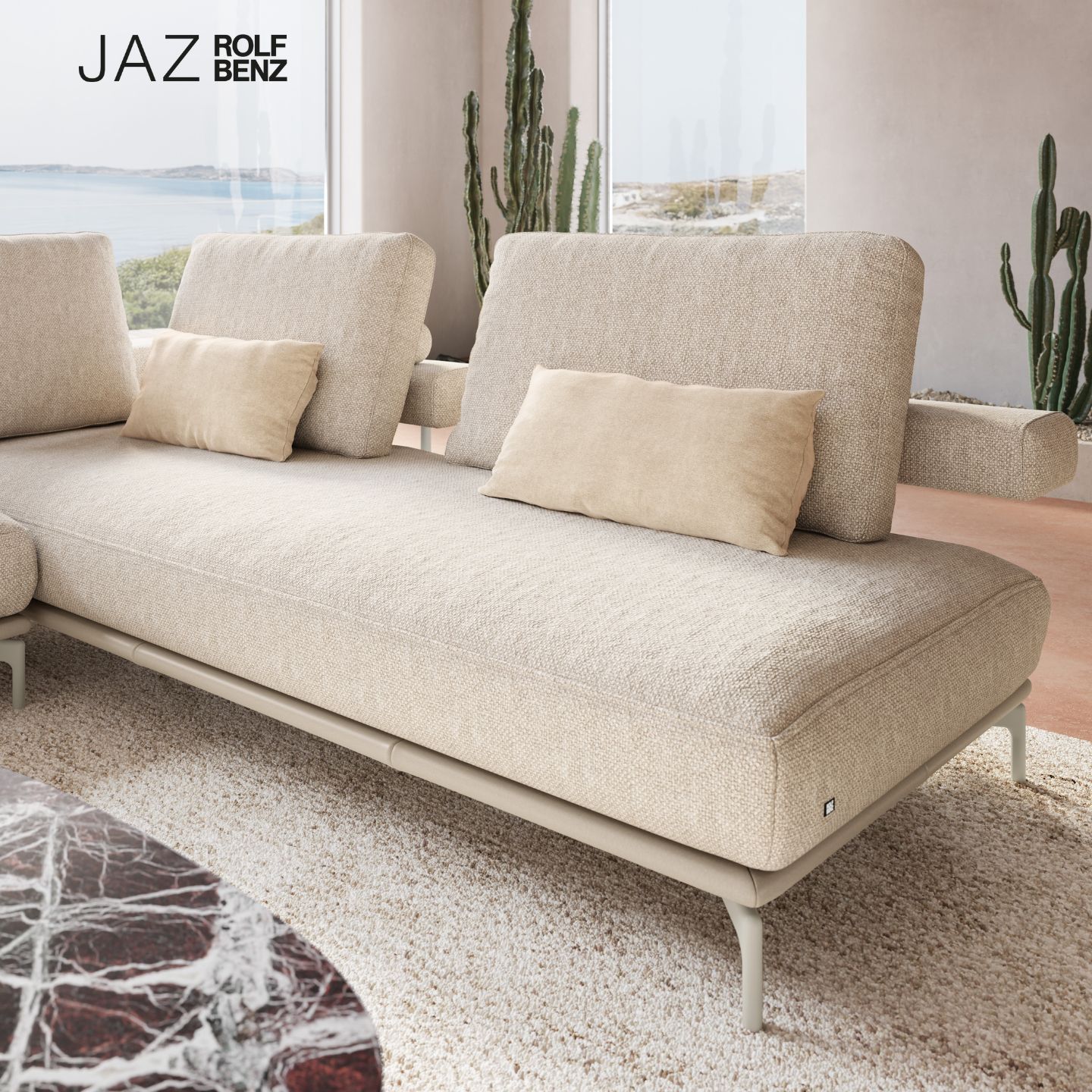 Mit seiner Kombination aus Leichtigkeit im Design, einer innovativen Komfortfunktion und hochwertiger Qualität in jedem Detail setzt das Sofa Rolf Benz JAZ neue Maßstäbe. Viel Bodenfreiheit und die charakteristische Durchsicht zwischen den Sitzpolstern und der durch ein graziles Aluminiumgestell gehaltenen Reling verleihen ihm eine einzigartige Transparenz. Die klassische Vorder- und Rückansicht eines Sofas scheint sich hier einfach aufzulösen.
